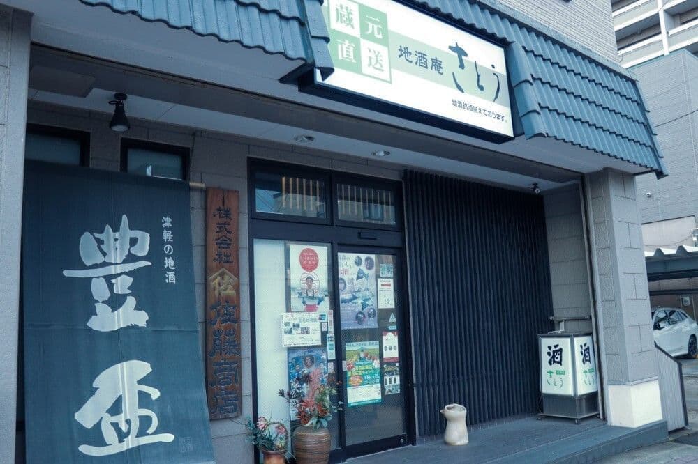 A liquor store with a standing bar area inside, featuring a certified sake sommelier "SAKE DIPLOMA", and offering a selection of appetizers that pair well with sake.