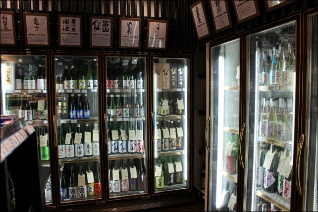"The numerous bottles of sake lined up inside the store."