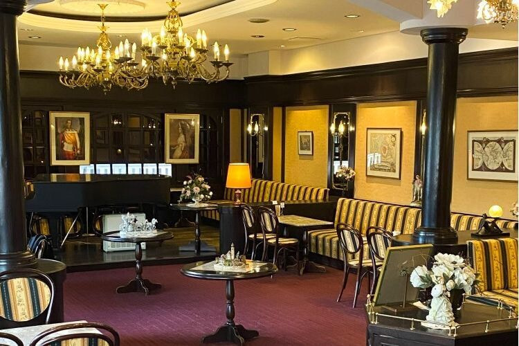 2階のカフェはシャンデリア、テーブル、美術品など、調度品をウィーンスタイルで揃えた重厚で上品な空間。